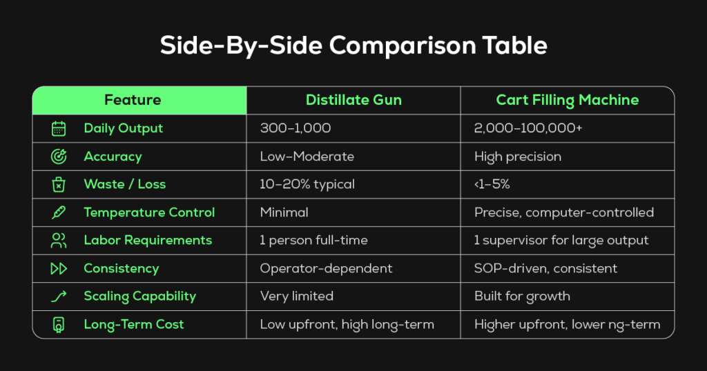 When deciding on a distillate gun vs a cart-filling machine for your operation, there’s nothing like a side-by-side comparison table to help. To summarize the main differences you need to know for scaling, take a look at the comparison of the major factors below.