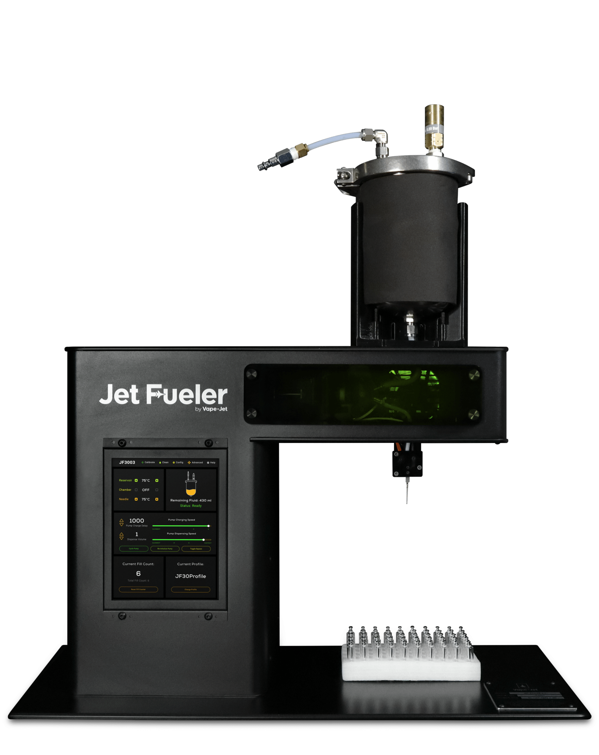 Simplify your cart-filling operation. Able to fill between 5000 and 9000 vape cartridges per shift, Jet-Fueler’s ergonomic and easy-to-clean design won’t clog up like repeater syringes or error-prone check-valve systems. A state-of-the-art nitrogen-assisted pharmaceutical-grade pump, advanced temperature control, and easy-to-use touch-screen interface allow you to fill smarter with unrivaled accuracy. Every machine comes standard with our industry-leading customer support, consultation, warranty, training, and calibration assistance.