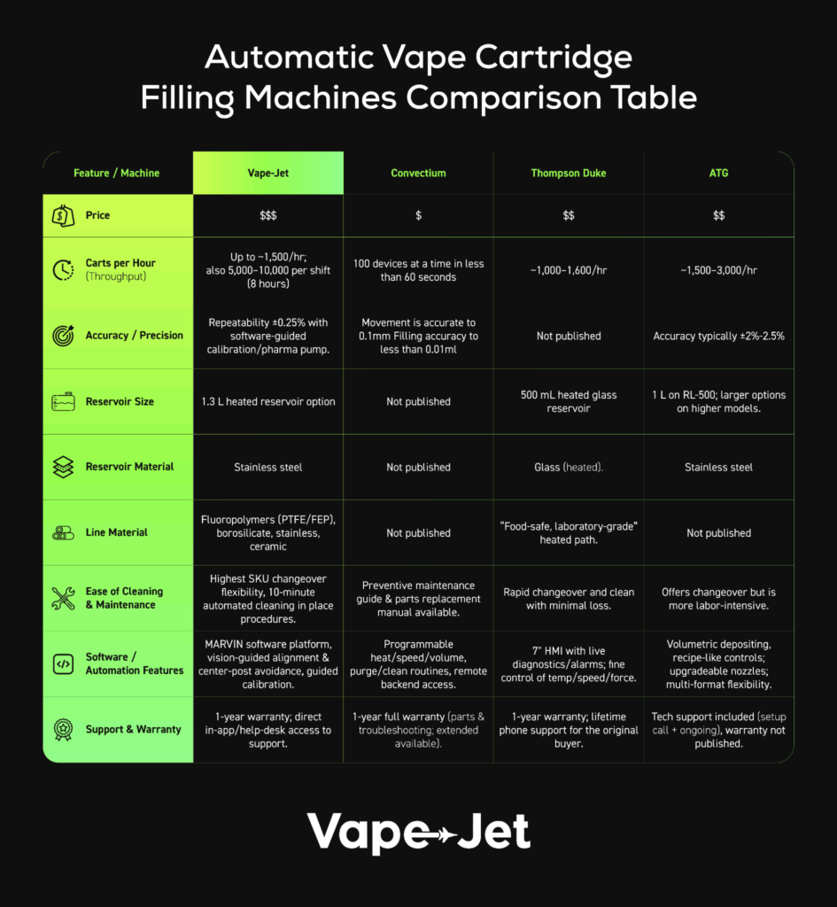 Nothing helps a decision more than pros and cons, and a comparison table with the top features for facilities to consider. So, here’s a quick side-by-side look at each of the best vape cartridge filling machines to help decide which is right for you.